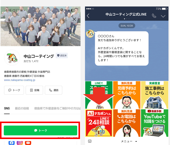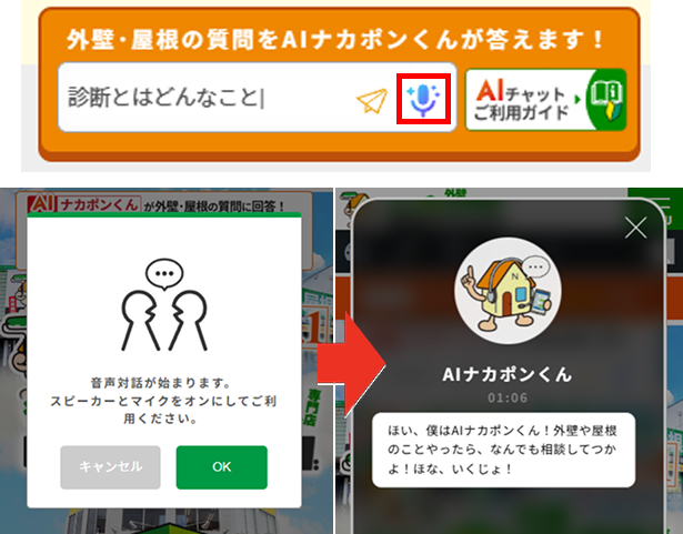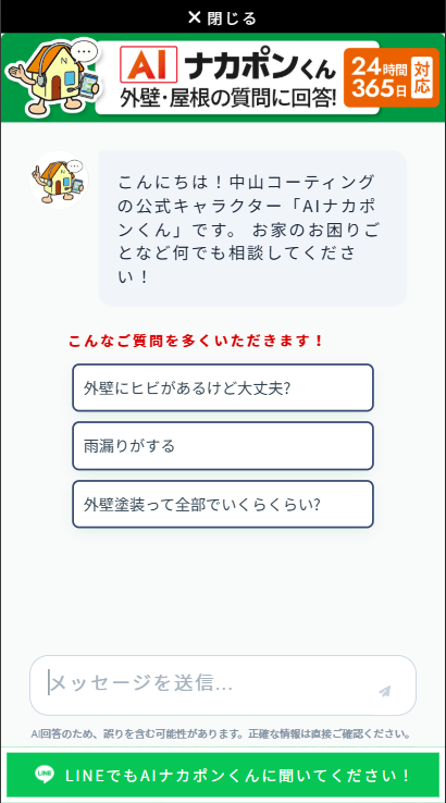 音声対話でも、外壁塗装・屋根塗装などの質問や相談ができます! AIナカポンくんと、気軽に電話のような感覚で対話をしてお悩み解決ができます。