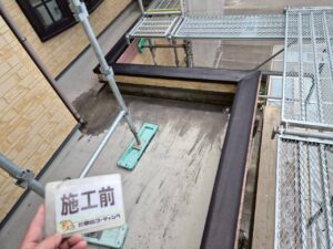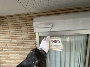 外壁の美観を左右するシャッターボックスや雨樋といった付帯部塗装では、まず「中塗り」で塗膜の厚みを確保し、色ムラのない均一な下地を丁寧に作り上げていきます。