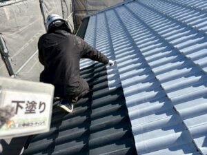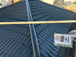 画像からも確認いただける通り、下塗りの白から中塗りの深い色へと変化する様子は、屋根に新しい防水性能と耐久性が宿っていく確かな証拠でもあります。