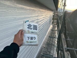 外壁塗装においても、塗料の密着性を高め剥がれを防ぐための重要なステップである下塗りを、北面や南面など各方位ごとに隅々まで徹底して行いました。