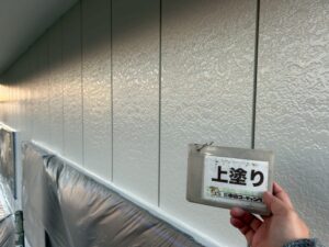 続く上塗り工程では、さらに同じ塗料を重ねることで、塗り残しやムラを完全に防ぎ、塗料が持つ本来の防水・防汚性能を最大限に引き出しました。