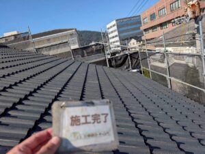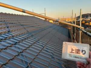屋根塗装では、仕上げとなる上塗りを施すことで、日差しや雨風から守る強固な塗膜と深く鮮やかな光沢を引き出しています。