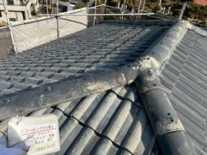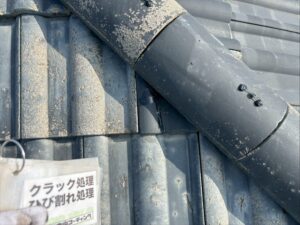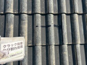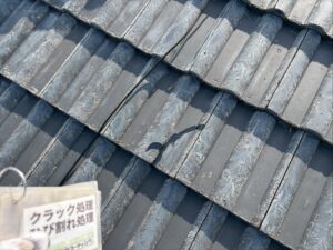 経年劣化で傷んだ屋根瓦を守るため、まずは瓦のひび割れ部分を一本ずつ丁寧に「クラック補修」して水の浸入を防ぎました。