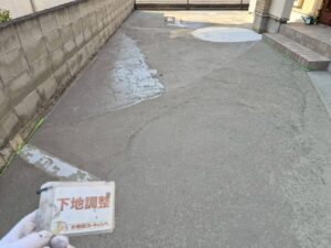 その後、既存の石張りやコンクリートの段差・ひび割れを一つひとつ丁寧に埋めていく「下地調整」の作業へと移ります。