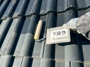 専用のローラーを使い、瓦の凹凸の隅々まで透明な下塗り材を浸透させることで、瓦自体を内側から強固に補強しました。