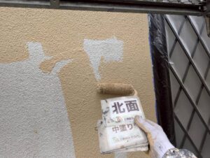 外壁塗装の要となる中塗りと上塗りの工程では、塗料の性能を最大限に引き出すため、ローラーを用いて厚みが均一になるよう丁寧に塗り重ねていきます。