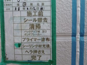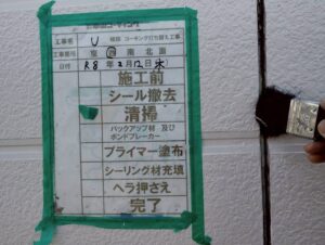 まず経年劣化で硬くなった既存のシール材を専用カッターで根元から綺麗に取り除き、新しい材料がしっかり密着するように溝の中の細かなゴミまで丁寧に掃除します。