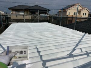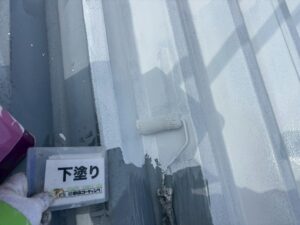 下地が整った後は、防錆効果の高い「下塗り塗料」をローラーでたっぷりと塗り込み、強固な基礎を形成します。