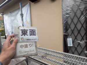 写真にある手元の札は「どの面を何回塗ったか」を証明する大切なしるしであり、一軒一軒の品質に対する責任を持って一筆ずつ心を込めて施工しております。
