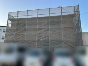 外壁の継ぎ目(目地)に沿って青いマスキングテープで丁寧に養生を行い、仕上がりの美しさと防水性能の両立を徹底いたしました。