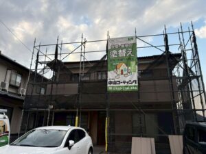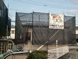 阿南市山口町 F様邸で外壁塗装が進行中|「WB多彩仕上げ工法」中塗りA色で土台を美しく