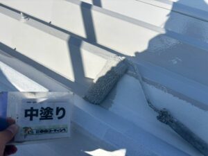 まずは専用のローラーを使い、屋根の凹凸に合わせて均一な厚みになるよう丁寧に中塗り塗料を塗り広げていきます。