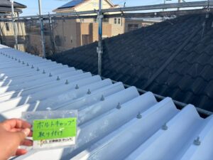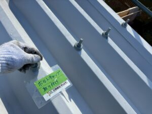 塗装に続いて、屋根の中で最も錆びやすいボルトの頭部を守るため、一つひとつ手作業でボルトキャップを確実に取り付けていきます。