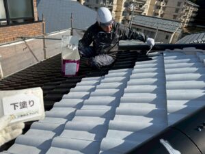 下準備を終えた後は、塗装の土台となる「下塗り」工程に入り、職人の手で一枚一枚ムラなく均一に塗り広げて瓦の吸い込みを抑えていきます。