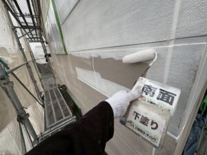 外壁塗装の土台を作る大切な工程である「下塗り」作業を、南面と東面の各方位で丁寧に進めております。