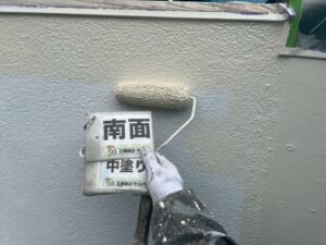 外壁塗装の重要な工程である「中塗り(なかぬり)」を丁寧に進めております。