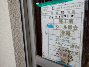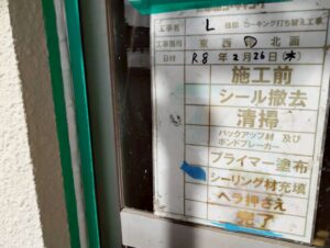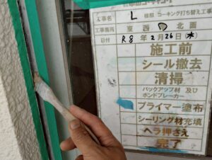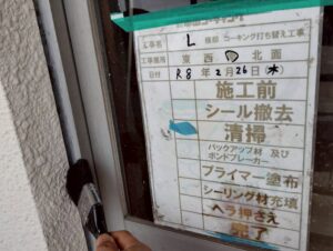 まずは既存のシールを丁寧に撤去して溝を清掃し、新しい材料がしっかり密着するよう専用の下地材(プライマー)を隅々まで塗り込んでいます。