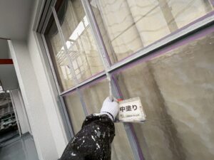 窓枠中塗り塗装作業を行います。
