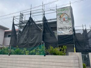 O様邸では外壁中塗り・上塗り、付帯部下塗り・中塗り塗装作業を行いました。