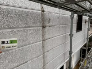施工前の建物は、目立つ黒ずみや広範囲の汚れによって、全体的にくすんでいるように見えました。