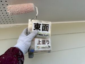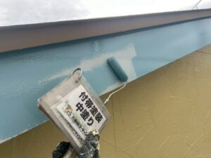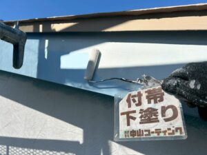 軒天とは、屋根の裏側にあたる部分で、外壁とは異なる環境にさらされるため、専用の塗料を使用して施工します。まずは下塗りを行い、既存下地の吸い込みを抑えながら、上塗り塗料との密着性を高めていきます。軒天は湿気がこもりやすい場所でもあるため、防カビ・防藻性能を持つ塗料を選定することが重要です✨