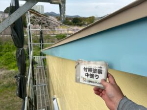 中塗りは、下塗りで整えた下地の上に、仕上げ塗料を1回目として塗布する工程です。塗膜に厚みをつけ、耐久性・防水性を高める役割があります。今回使用している塗料は、耐候性・低汚染性に優れた高性能塗料。均一に塗り広げることで、ムラのない美しい仕上がりを目指します✨