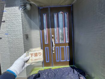 ドアのガラス部分や外壁などに塗料飛散しないようビニールで養生を行います。