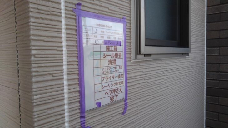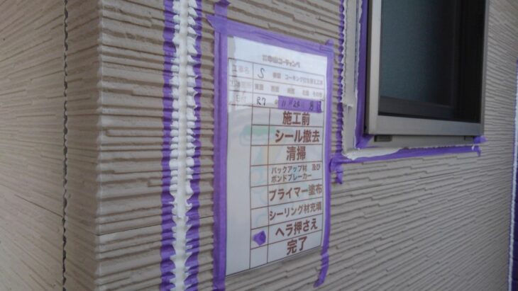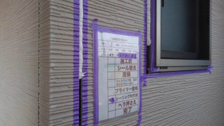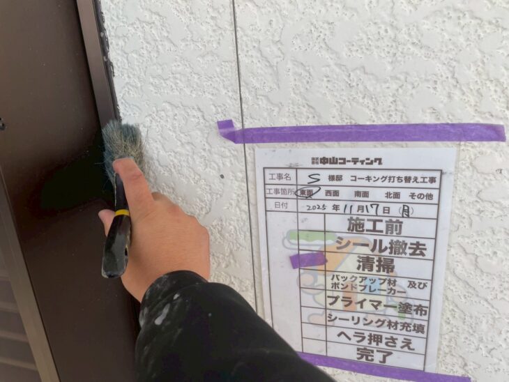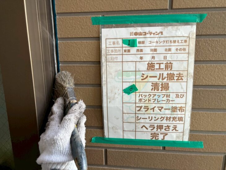 既存の古いコーキングを撤去後、溝のブラシ清掃・プライマー塗布を行い、新しいコーキング材を丁寧に充填。
