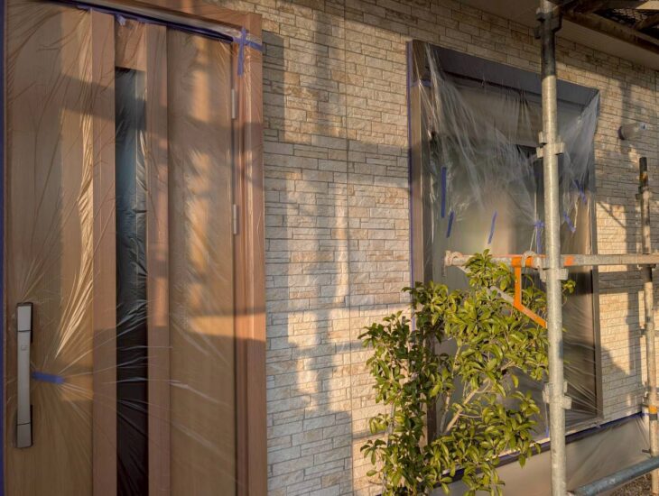 外壁塗装前の準備作業として、玄関ドアや窓をビニールで囲い、塗料の飛び散りや付着を防ぎます。