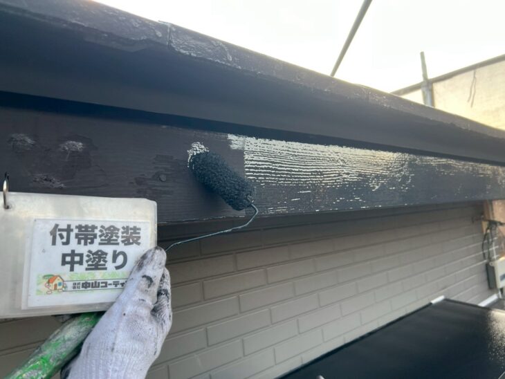 破風鼻隠し中塗り塗装を行います。
