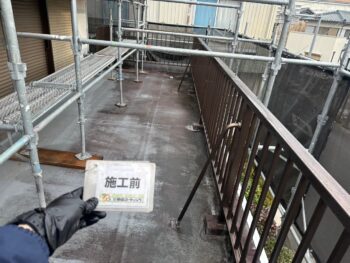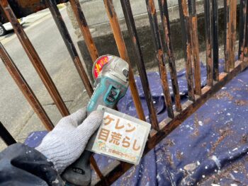 錆が目立ちます。ケレン作業で錆を落としながら表面に細かいキズをつけて塗料の密着性を高めます。