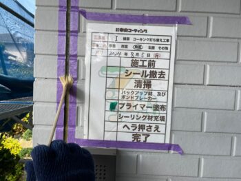 既存のコーキング材を撤去し、溝をブラシで清掃します。