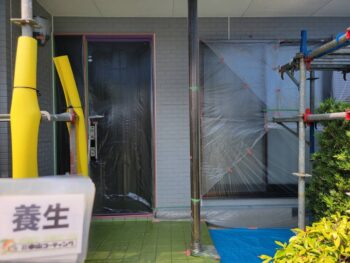 塗料が付着しないよう、窓やドアにビニールで養生を行います。