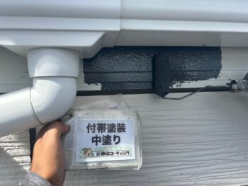 雨樋や破風 中塗り塗装を行います。