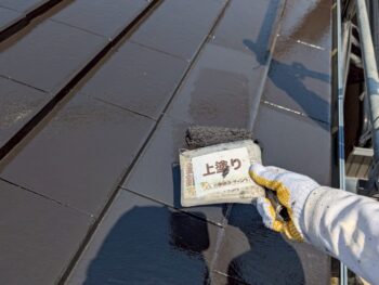 屋根上塗り塗装作業を行います。