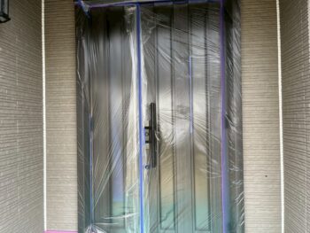 玄関ドアは開けることができるよう養生しています。