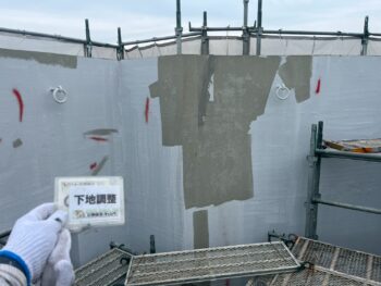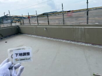 今回は壁面下地の調整を行った後、立ち上がり部分の下塗り、そして上塗り塗装を実施しました。