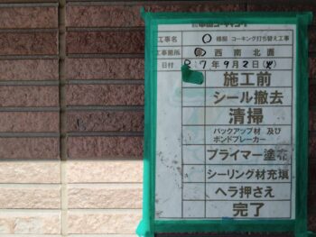 古いコーキング材を撤去 → 清掃 → プライマー塗布 → 新しいコーキング充填 → ヘラ仕上げ。