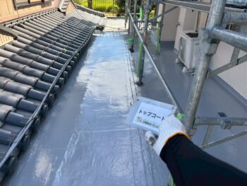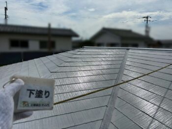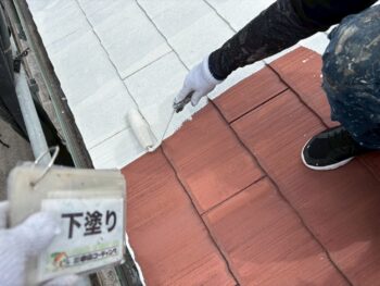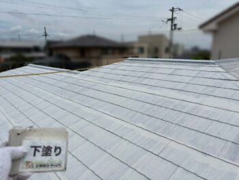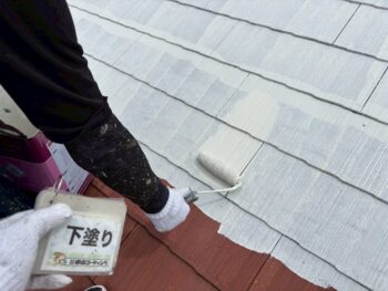 下地処理を丁寧に行い、屋根下塗り塗装を実施。今後、上塗りを重ねることで、防水性と耐久性を高めます✨