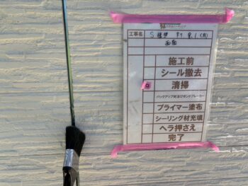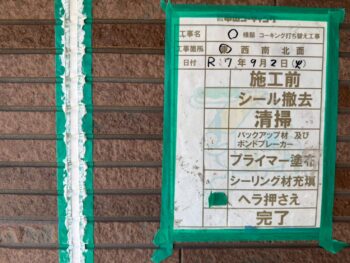 放置すると雨水の侵入や外壁材の劣化につながるため、既存の古いコーキングを撤去し、溝を清掃後、プライマーを塗布。