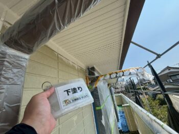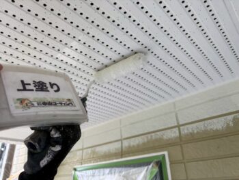 軒天井の下塗り・上塗りを行いました。 外観を美しく整えるとともに、湿気や劣化から建物を守る大切な施工です。
