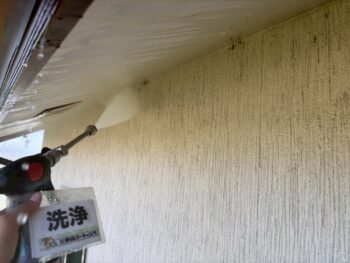 長年の汚れやカビを高圧の水で一掃! 塗装の下準備として欠かせない工程で、塗料の密着性を高める重要な作業です。