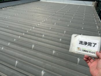 駐車場屋根を高圧洗浄し、苔や汚れをしっかり除去。定期メンテナンスで建物の寿命を守ります。