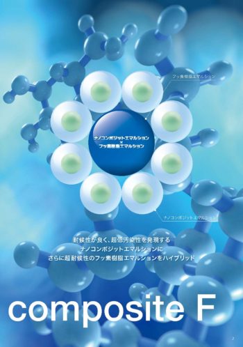 20~30nmの超低汚染親水性シリカの周りをフッ素樹脂との親和性高めるために特殊設計したUVA・HALSハイブリット型アクリルシリコン樹脂で覆った非常に小さなエマルション樹脂です。