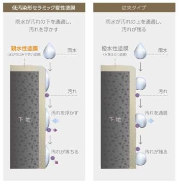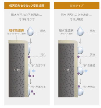 低汚染性の高い塗料は水のなじみやすい塗膜のため雨水で汚れを流し落とします。