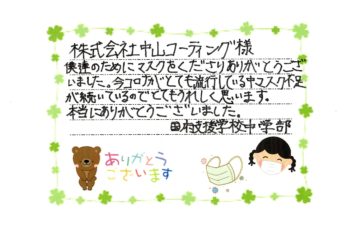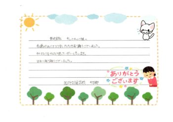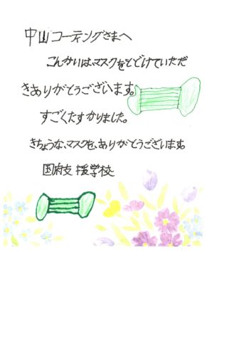 話は変わりますが4月に寄贈しました徳島県立国府支援学校長様よりマスクのお礼を頂きました。