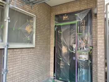 阿波市では着工中のM様邸では玄関周りの特殊塗装WB多彩アート工法で