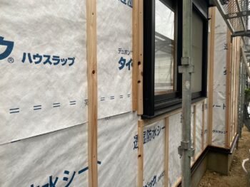 今回は横張に外壁材を張るので胴縁(木材)は縦に張っております。