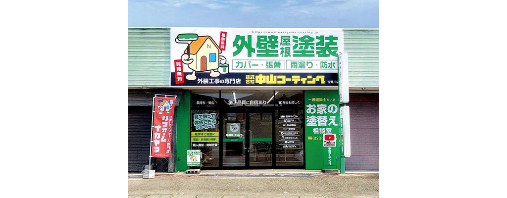 大きく目立つ2色の看板を持つ徳島店は、塗装専門ブランドの中山コーティングとリフォーム専門ブランドリフォームナカヤマによる496㎡(約140坪)の面積を誇る塗装・リフォーム体感ショールーム。外装専門店によるショールームとしては徳島県最大級。最新商品から人気商品まで様々な展示をしています。