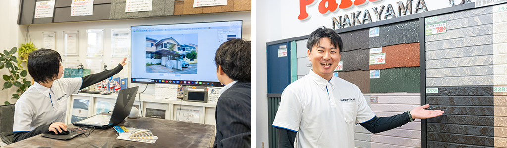 外壁・屋根工事は、完了後からが本当のお付き合いの始まりです。「会社の顔が見える」こと、つまり、専門知識を持つスタッフが常駐し、いつでも相談や塗料や施工事例など現物の確認ができる店舗を構えていることは、その会社が地域に根ざし、お客様と末永くお付き合いしていく覚悟があることの何よりの証拠です。